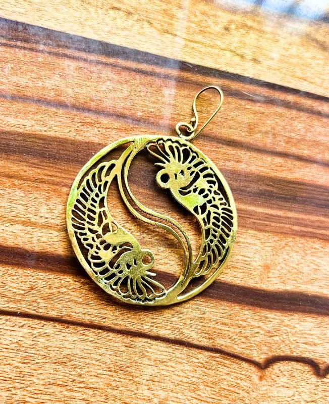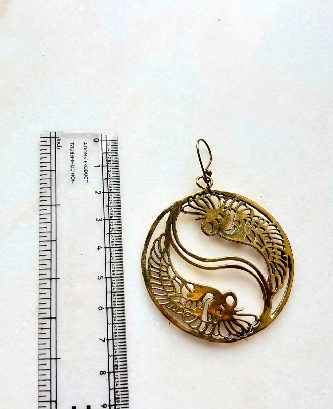These stunning brass earrings combine traditional symbolism with exquisite filigree detail. The design showcases two phoenixes gracefully intertwined within a circular Yin Yang frame, representing harmony between opposing forces. Each curve and cutout highlights the skilled craftsmanship that goes into creating these pieces.