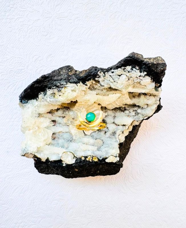 This elegant crescent moon brass ring combines celestial charm with earthy elegance. The design features a smooth green stone set in the heart of a handcrafted crescent moon, representing renewal, intuition, and harmony. Made from pure brass with a warm golden finish, it’s ideal for bohemian, spiritual, and artisan jewelry collections.