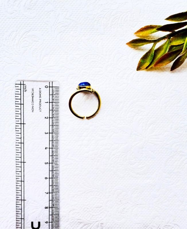 This stunning adjustable brass ring features a mesmerizing deep blue cabochon stone set in a handcrafted brass frame. The open-band design allows flexibility in sizing, making it suitable for most fingers. Each ring is individually handmade, showcasing slight variations that make every piece unique.