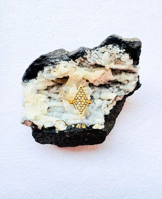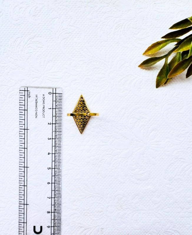 Elegant handcrafted brass ring featuring a geometric diamond-shaped filigree design. Lightweight and adjustable, perfect for bohemian and artisan-inspired jewelry collections.