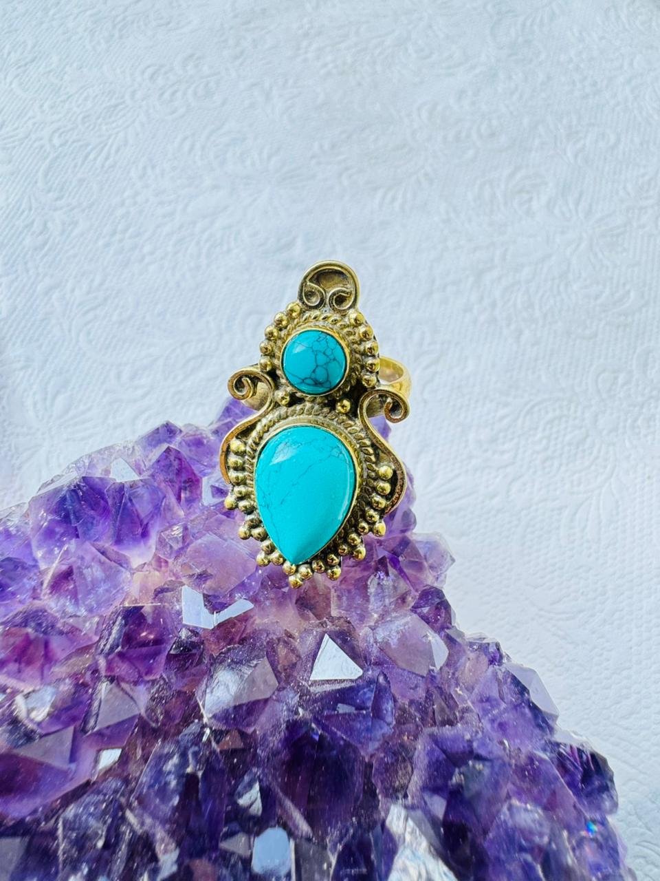 Brass Drop Stone Turquoise Ring with Intricate Work