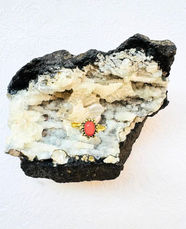 Brass Handcrafted Adjustable Ring with Coral Red Stone