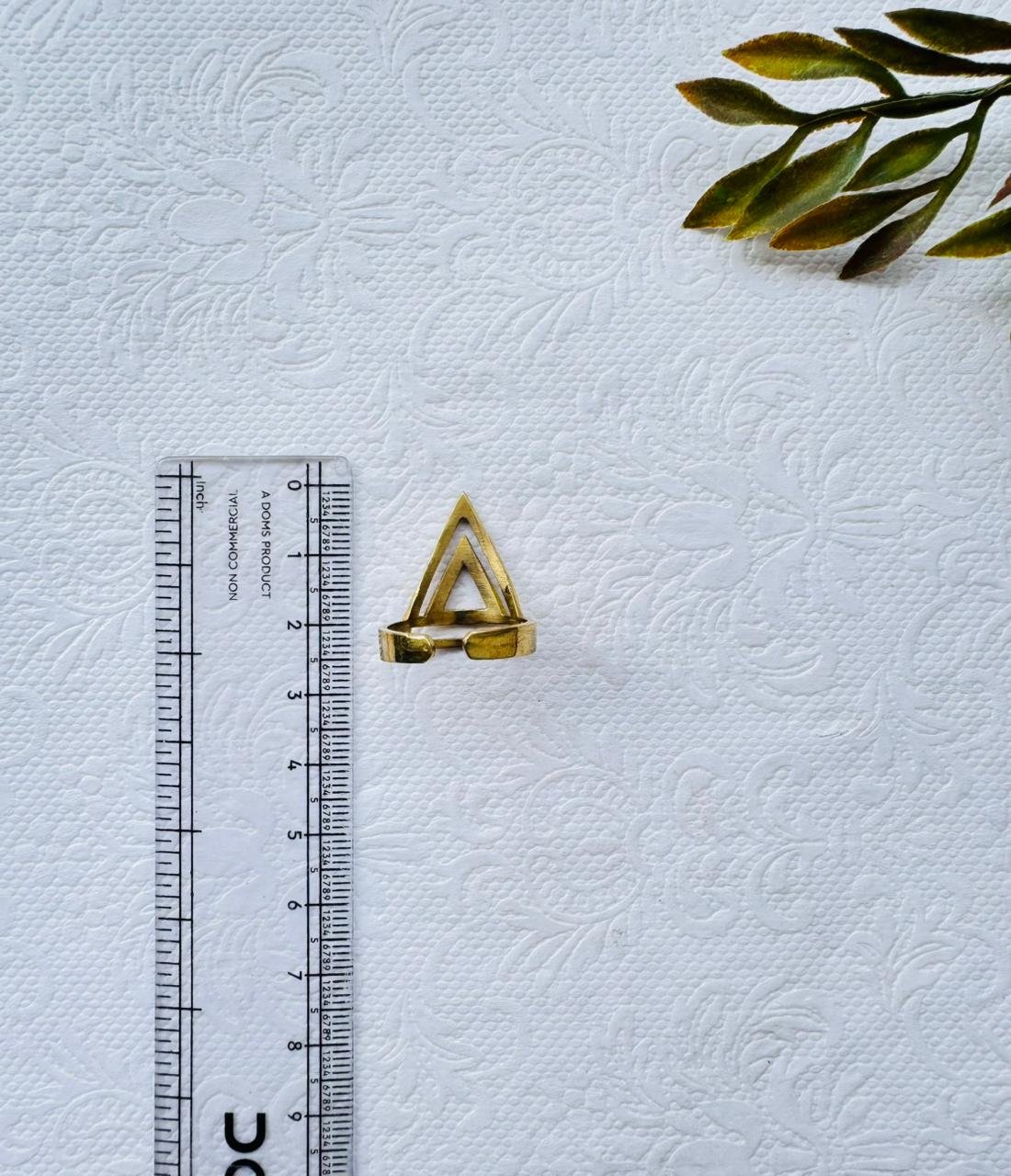 This jewelry piece is a gold-tone ring with a prominent geometric focal point. The design features a large outer triangle with a smaller, solid-looking triangle nested within its lower half, creating a layered architectural effect. The triangles are mounted on a wide, polished band that appears to have an adjustable open-shank design at the back. The metal has a bright, yellow-gold finish with smooth, reflective surfaces. In the image, the ring is displayed atop a jagged purple amethyst crystal cluster, which provides a sharp color contrast against the metallic gold of the ring.