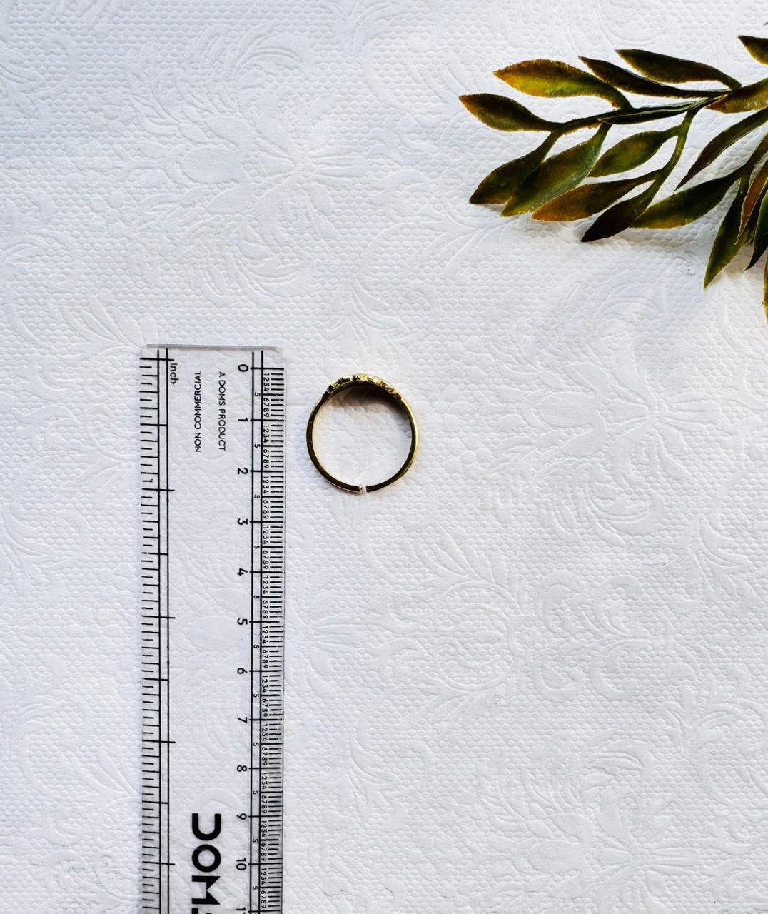 This jewelry piece is a gold-tone ring featuring a raised decorative crest that mimics the shape of a tiara or crown. The motif is a semi-circle containing an intricate openwork design with stylized, pointed petals radiating outward. At the very center of the base, there is a small, textured sunburst or fan detail accented with tiny metallic beads.