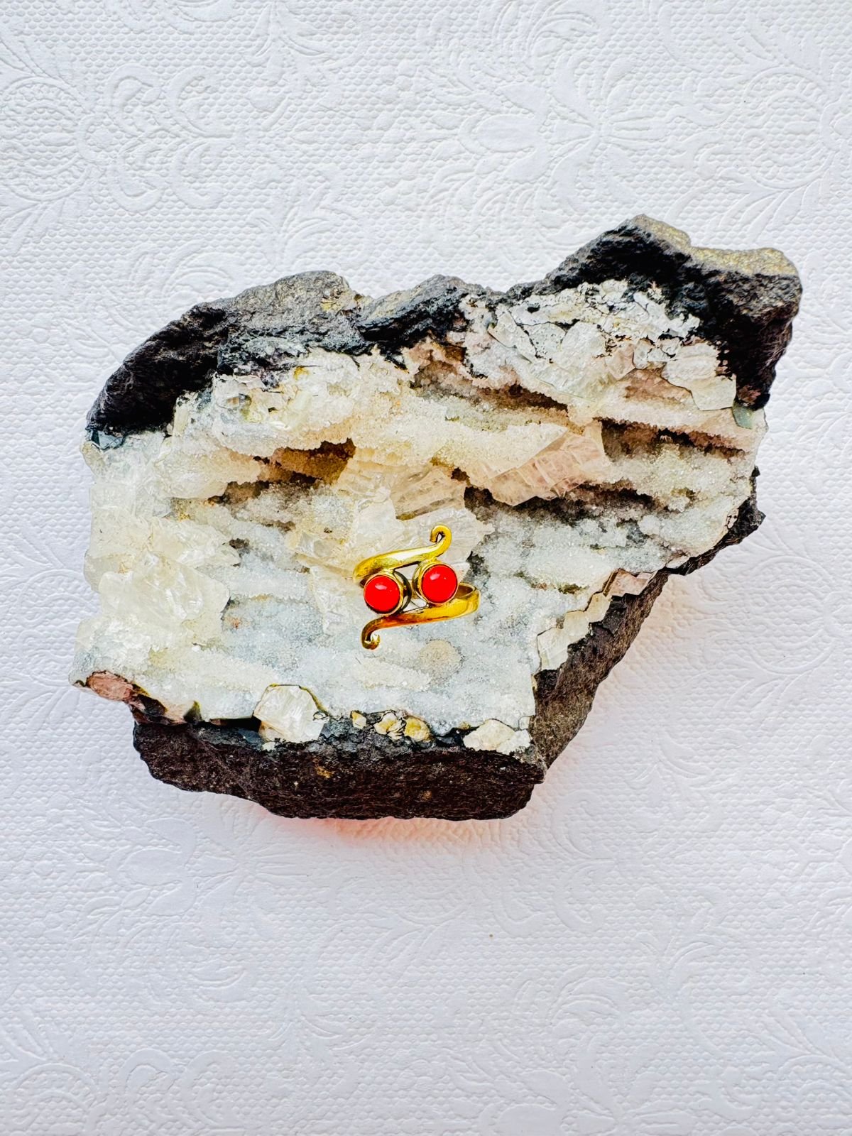 This elegant handcrafted brass ring combines a timeless spiral shape with bold, fiery red enamel stones. Each ring is artisan-made, showcasing the natural golden warmth of polished brass paired with a pop of vibrant color. The open-back design allows flexibility for various finger sizes, making it both stylish and practical.