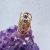 An ornate gold-colored ring featuring a central round turquoise cabochon surrounded by four black teardrop-shaped stones in a cross-like formation, resting on a purple amethyst cluster.