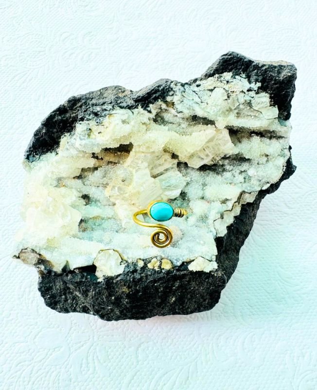 This beautiful spiral brass ring showcases a genuine turquoise gemstone, symbolizing protection, calm, and creativity. Expertly handcrafted by skilled artisans, the design wraps gracefully around the finger with a unique open spiral form that ensures both comfort and style.