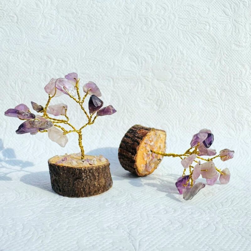 Handcrafted Amethyst gemstone bonsai tree with purple stone chips and a natural wood base. A grounding decor piece symbolizing strength, stability, and balance.