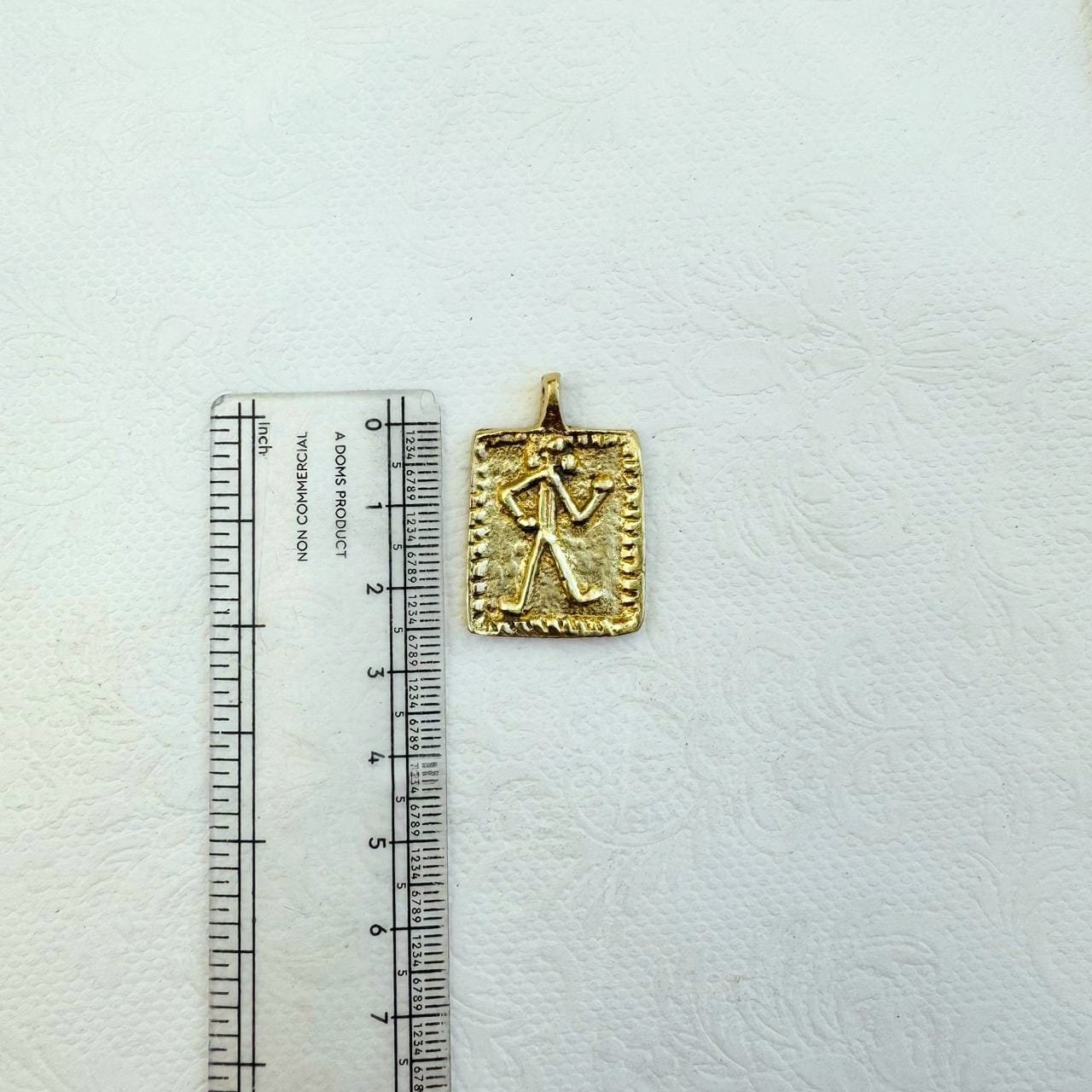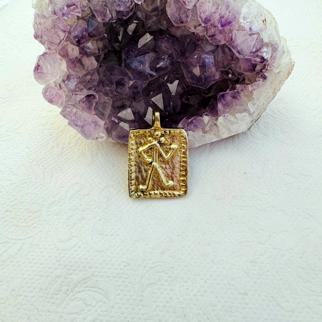 This solid brass pendant charm features a rectangular shape with a raised, stylized human figure at its center. The figure is rendered in a simple, almost pictographic form, giving the charm an ancient, symbolic character reminiscent of early relief art and historical motifs.
