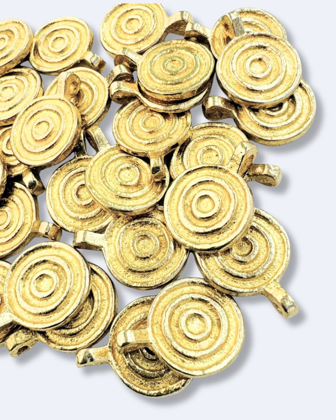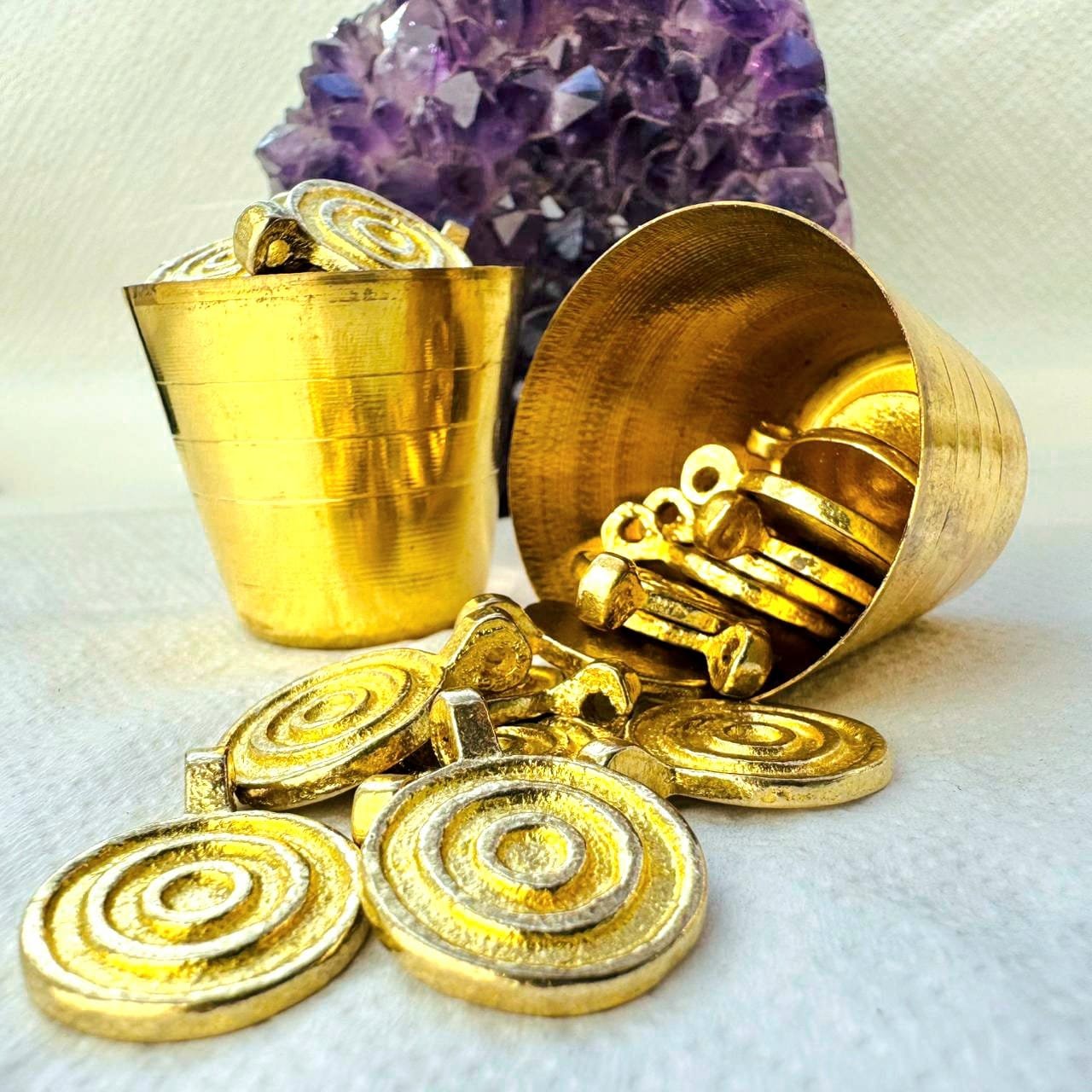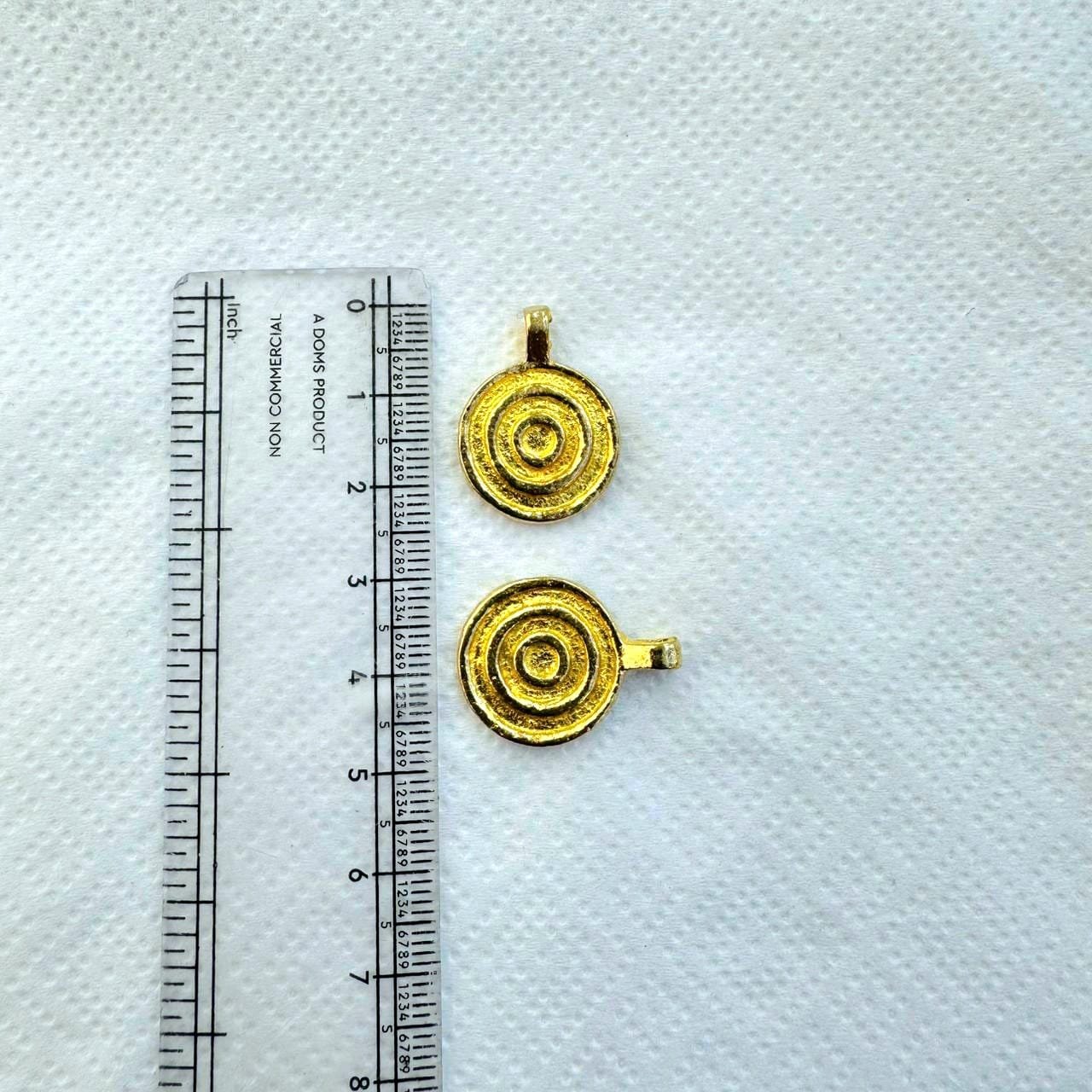These brass charms feature a bold round shape with a raised concentric spiral pattern, finished in a warm gold tone. The spiral motif is a timeless symbol of movement, energy, and continuity, making it a versatile choice for a wide range of jewelry styles.