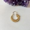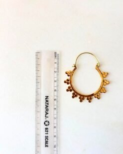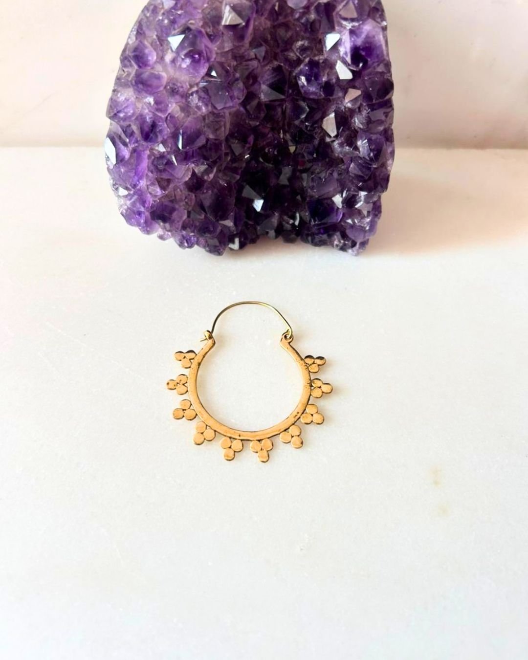 This charming brass hoop earring features a classic circular shape accented with delicate petal-like drops along the lower half of the hoop. The small dangling elements add texture and movement, creating a lively design that catches the light beautifully.