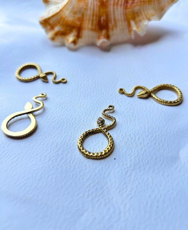 This charming piece showcases a unique snake pendant, coiled into an elegant loop or infinity-inspired shape. Some versions feature intricate scale-like textures while others offer a polished minimalist finish. Its small size and golden sheen make it perfect for delicate jewelry, earrings, or symbolic additions to bracelets and necklaces.
