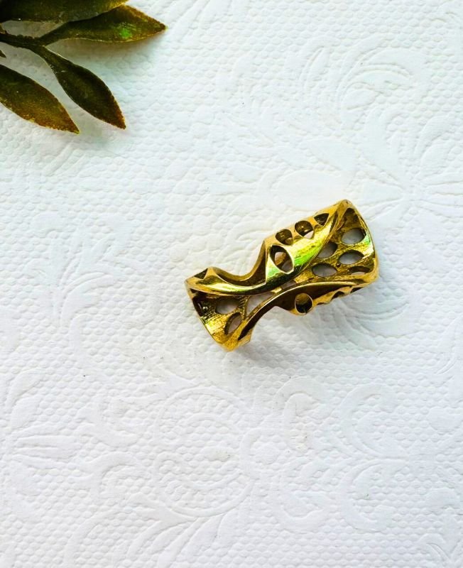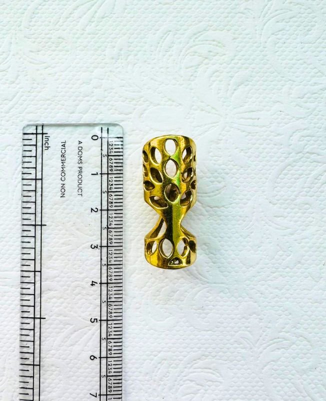 Add an architectural focal point to your hairstyle with this striking contoured brass dreadlock cuff. This bead features a distinctive hourglass or cinched shape, tapering in the middle before flaring out again at the top and bottom. The surface is adorned with an openwork pattern of repeated oval cutouts, allowing your hair’s texture to show through while ensuring the cuff is lightweight and airy.