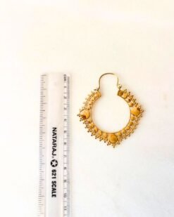 This distinctive brass hoop earring features a beautifully ornamented crescent design accented with raised circular elements and fine bead-like detailing along the outer edge. The composition creates a rhythmic decorative pattern that gives the piece depth and character.