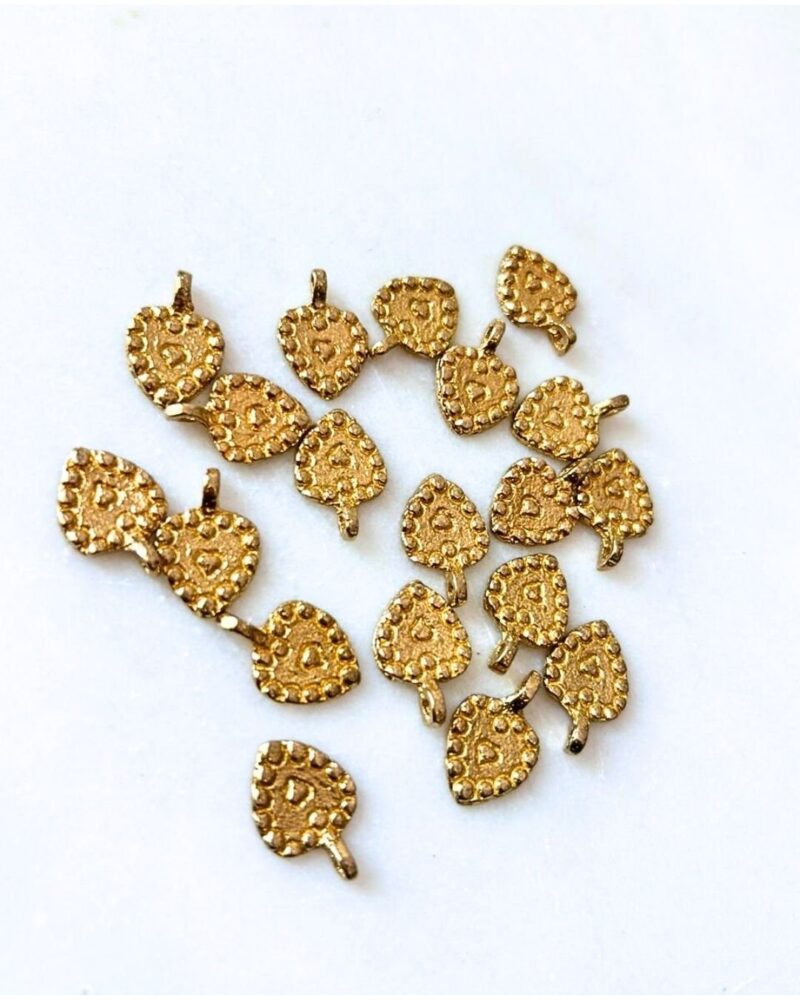 This teardrop shaped brass charm features a rich decorative pattern with raised dot detailing and a central motif, finished in a warm gold tone. The textured surface and symmetrical shape give the charm an elegant, slightly vintage feel that works beautifully in both classic and bohemian jewelry styles.