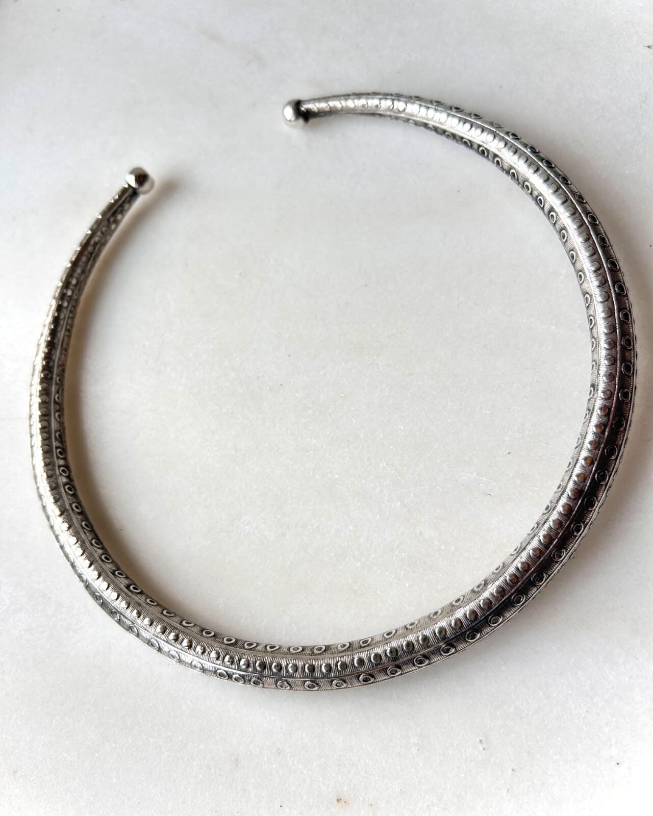 This handcrafted brass choker is finished in a silver-tone patina and adorned with intricate engraved and dotted details along its entire length. The textured surface adds depth and character, reflecting traditional metalworking techniques with a contemporary wearable form.
