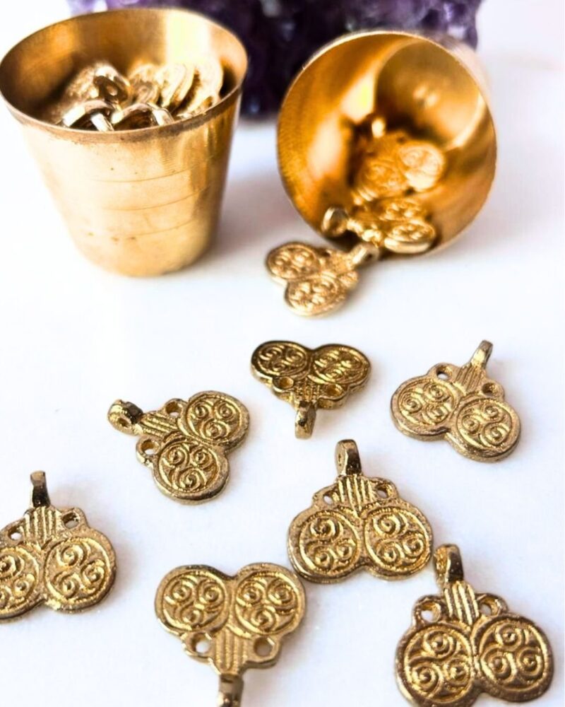 This double spiral filigree brass charm showcases an ornate, symmetrical design with raised spiral detailing and a polished gold-tone finish. The dual spiral motif gives the charm a balanced, vintage inspired look that works beautifully in both boho and ethnic style jewelry.