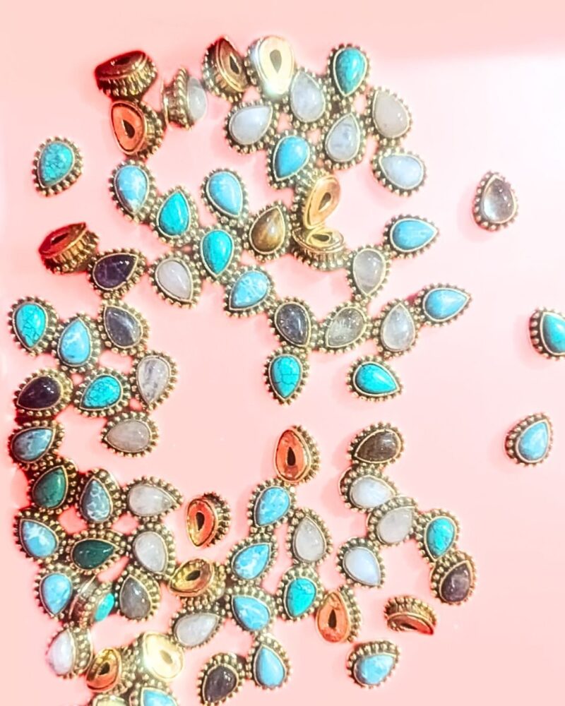 Perfect for embellishing traditional jewellery, clothing, or spiritual crafts, these floral gemstone charms bring a touch of bohemian and cultural elegance to any project. The flat back design allows for easy gluing onto surfaces, making them versatile for creative and decorative applications