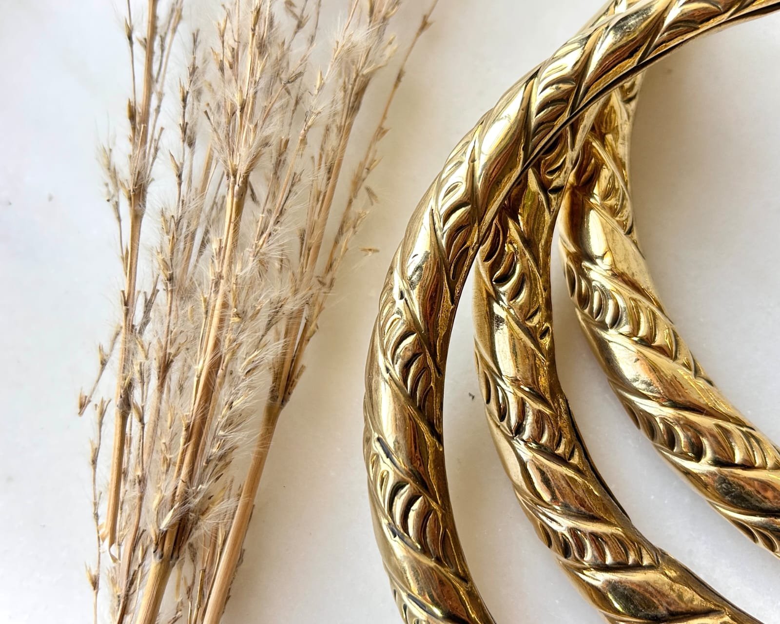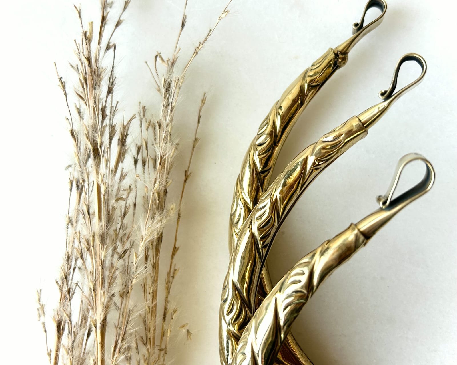 This handcrafted brass choker features an elegant twisted silhouette with engraved leaf-style details that catch the light from every angle. Its sculptural form creates a strong yet organic presence, making it perfect as a standalone statement piece or as a base for layered, creative designs.