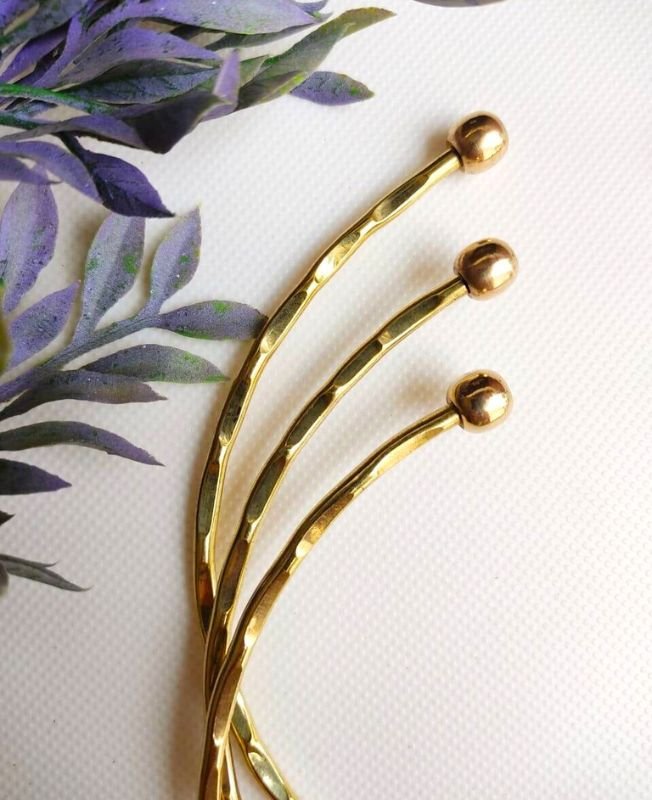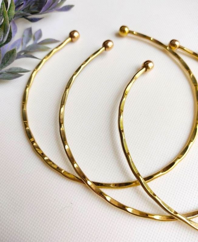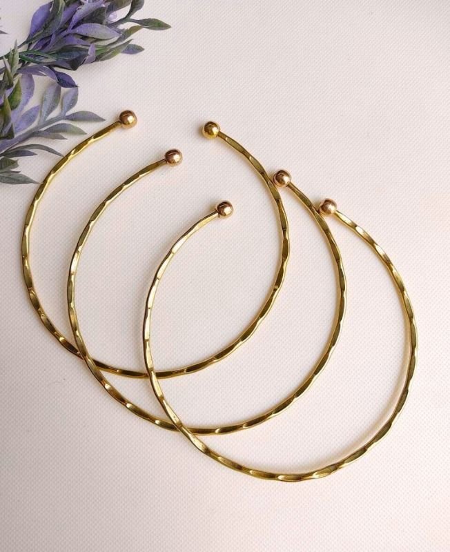 This elegant choker set includes three handcrafted brass pieces, each shaped with a fine hammered texture and slim, refined profile. The irregular facets along the surface catch the light softly, creating a subtle shimmer effect while preserving a handcrafted, organic feel. The rounded ball tips complete the form with comfort and simplicity.