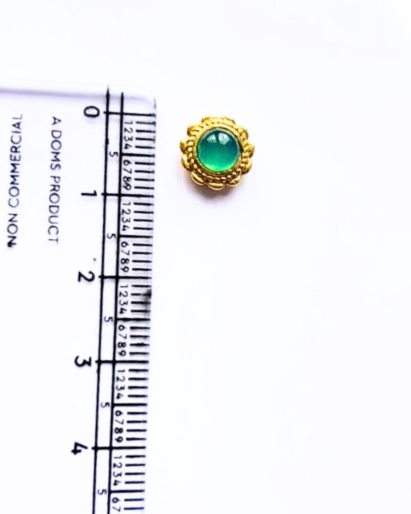This exquisite assortment of round brass grooved carefully set in a floral shaped gold toned bezel. The stone’s vibrant green hue radiates a natural elegance, while the intricate petal-like frame adds depth and sophistication to the design. Its smooth cabochon cut enhances the stone’s luster, making it a beautiful focal piece.