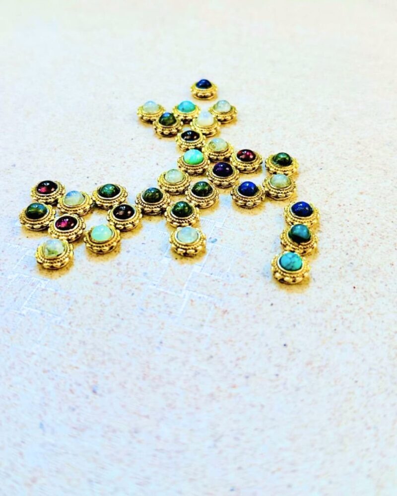 This exquisite assortment of round brass grooved carefully set in a floral shaped gold toned bezel. The stone’s vibrant green hue radiates a natural elegance, while the intricate petal-like frame adds depth and sophistication to the design. Its smooth cabochon cut enhances the stone’s luster, making it a beautiful focal piece.