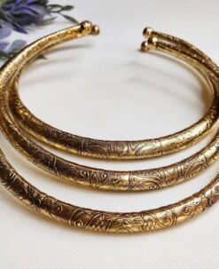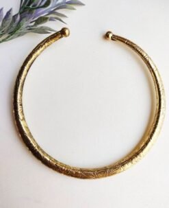 This unique choker set includes three handcrafted brass pieces, each adorned with a combination of geometric and tribal-inspired etchings. The patterns create a bold, structured look that blends traditional design with a contemporary edge. Rounded tips and a smooth finish ensure a comfortable fit around the neck.