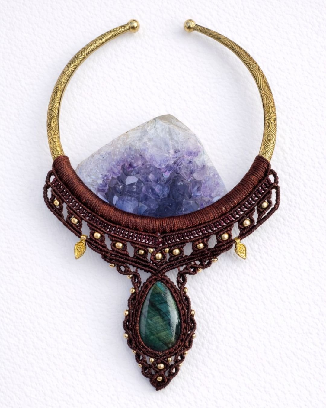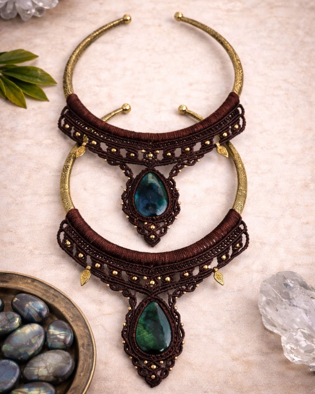 This handcrafted macramé choker is designed as a bold yet refined statement. The base is formed by a solid engraved brass collar, wrapped and detailed with deep brown waxed macramé thread. At the center hangs a natural green labradorite stone, displaying subtle color shifts and organic patterns unique to each stone.