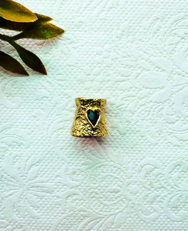 This adorable brass dreadlock bead offers a unique blend of rustic texture and charming detail. The body of the cuff features an appealing hammered or naturally rugged surface, giving it an artisanal, hand-crafted look. Centered on the bead is a carefully inlaid heart shape, filled with a dark stone or enamel, which provides a striking contrast against the warm glow of the brass.