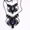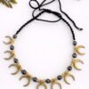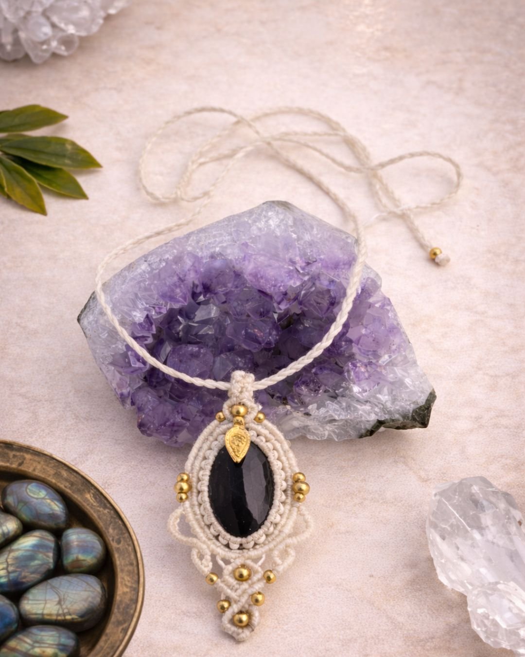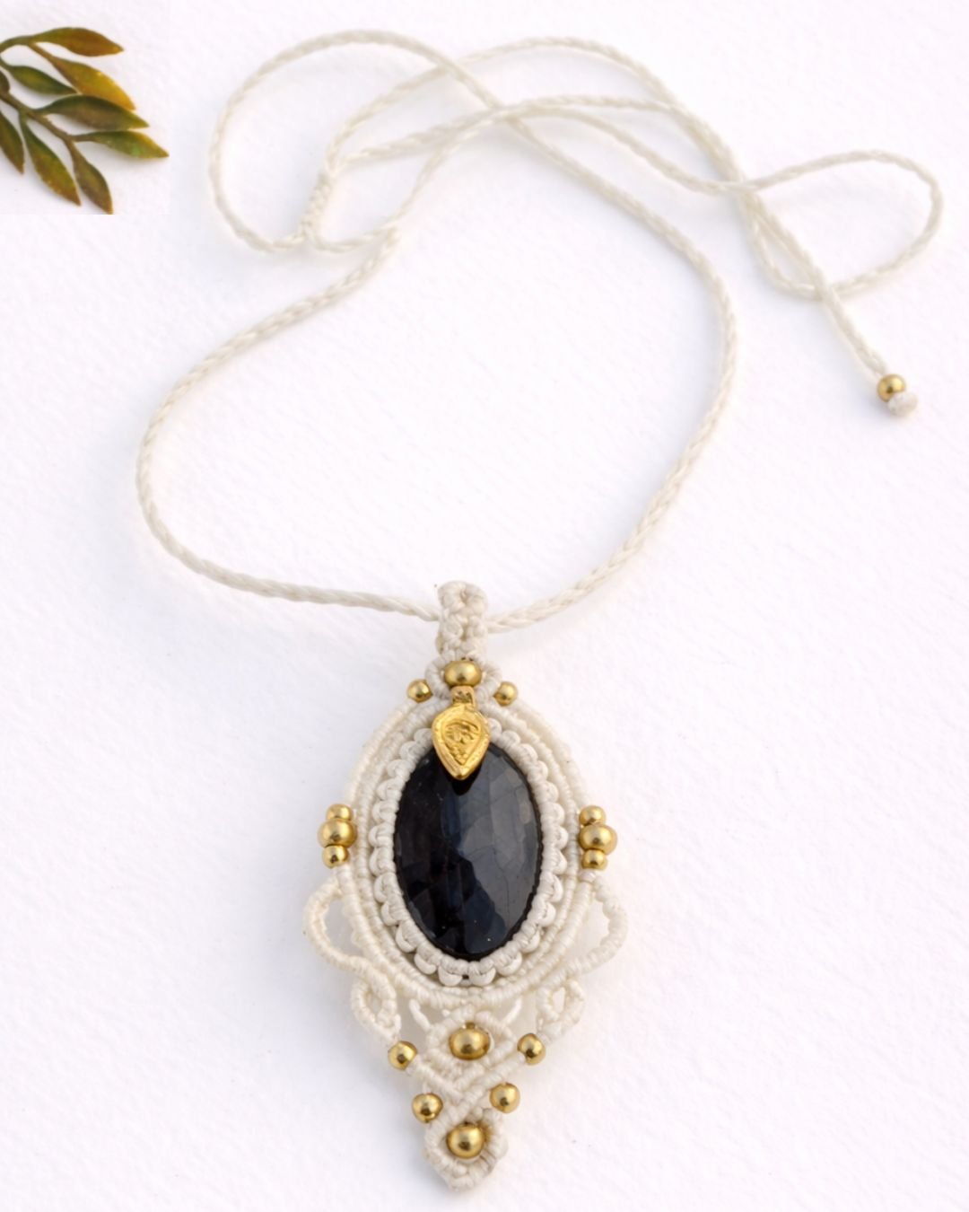 Handcrafted double row wax thread macrame necklace featuring an oval polished stone center piece and delicate brass bead details. Lightweight, adjustable, and perfect for bohemian or minimalist styles.