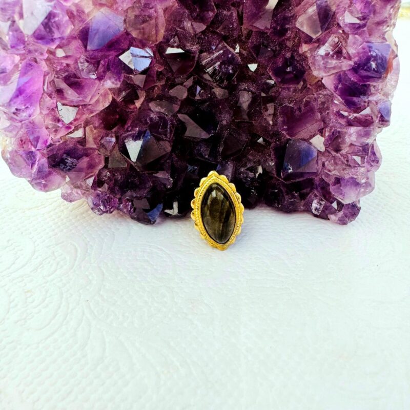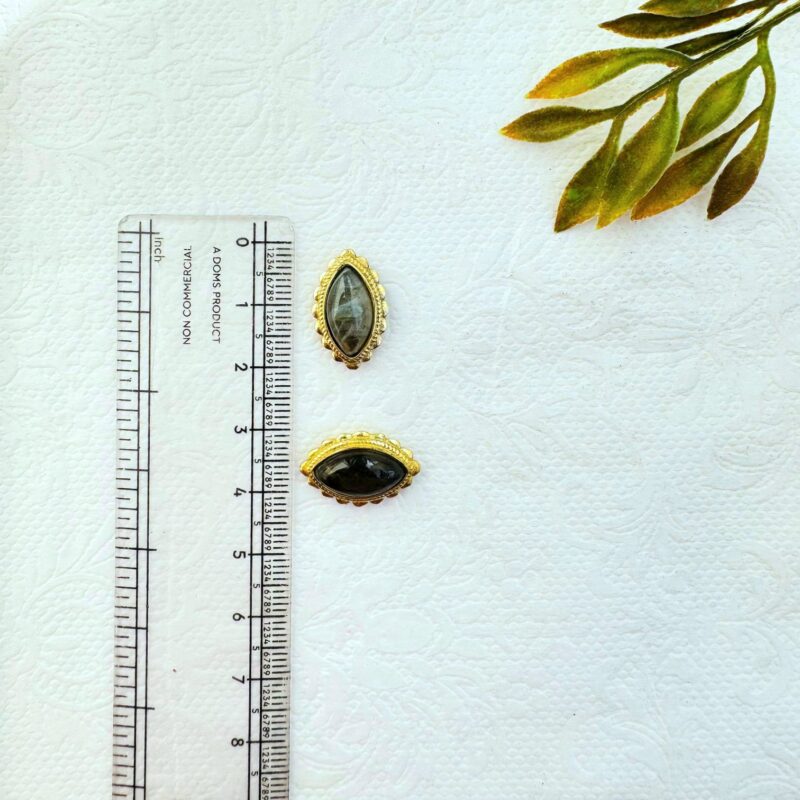 Elegant marquise shaped brass gold toned settings with fine grooved edges, featuring natural Labradorite stone