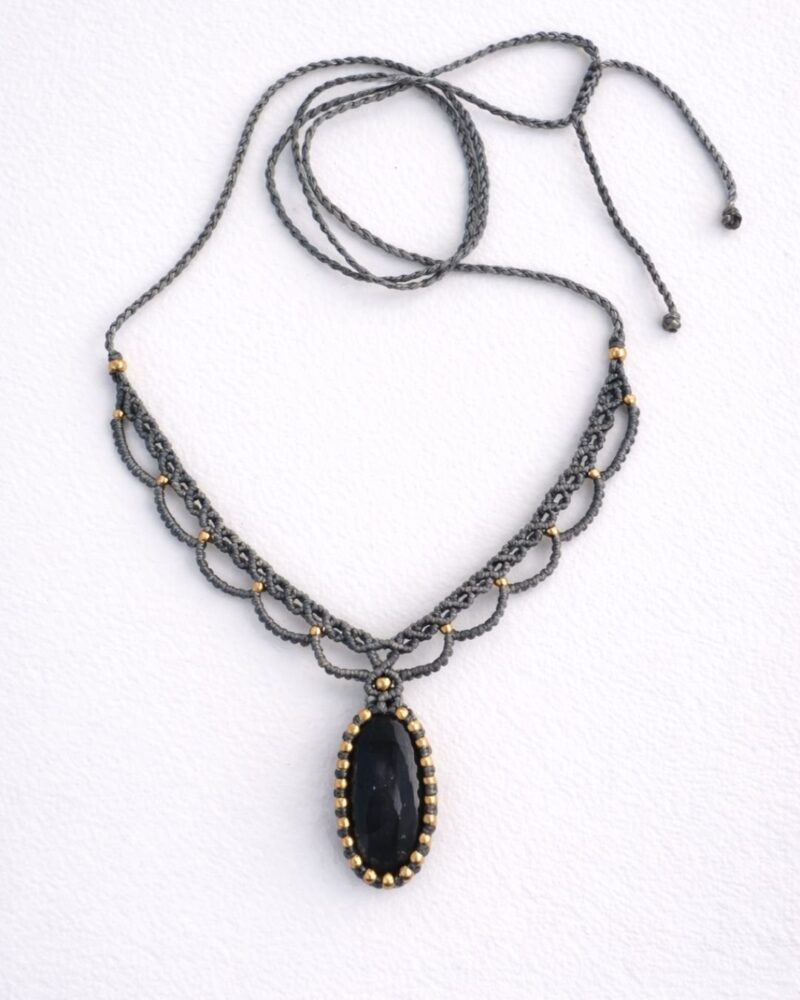 This handcrafted waxed thread macrame necklace features a beautifully polished oval stone pendant, carefully wrapped and accented with small brass beads. The intricate macramé work creates a soft yet structured neckline, offering both comfort and durability.
