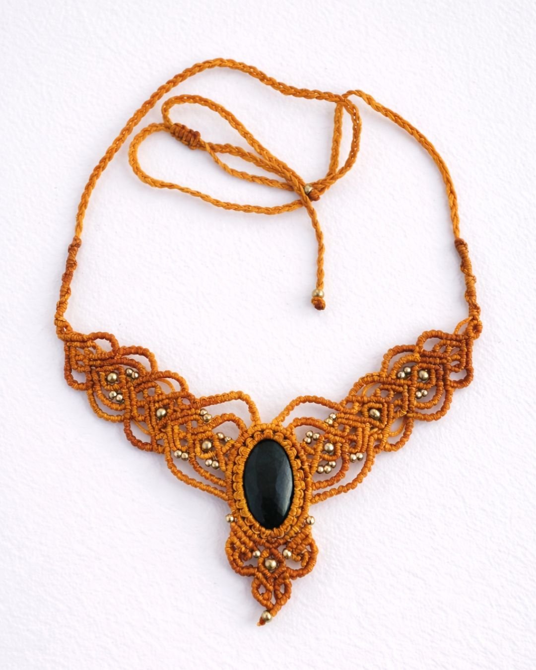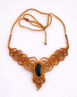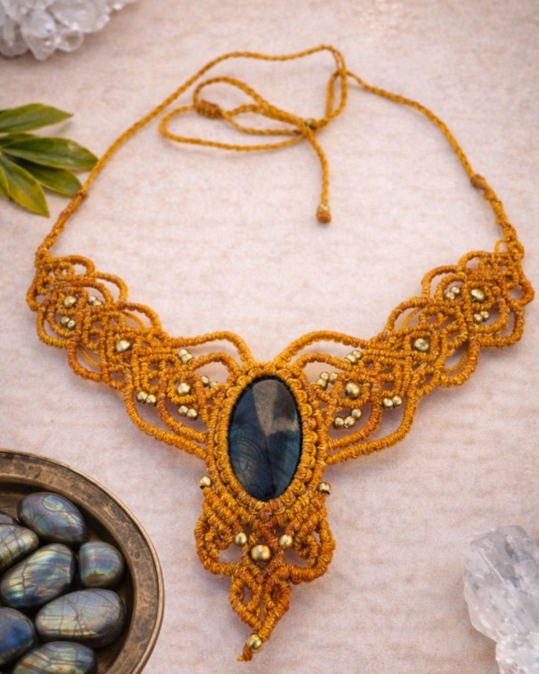 This handcrafted waxed thread macramé necklace is a bold yet elegant statement piece, designed for lovers of earthy, bohemian jewelry. The warm mustard-toned waxed cord is intricately knotted to create a symmetrical lace-like pattern, centered around a natural labradorite stone with subtle flashes and depth.