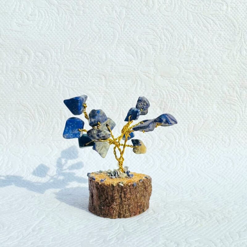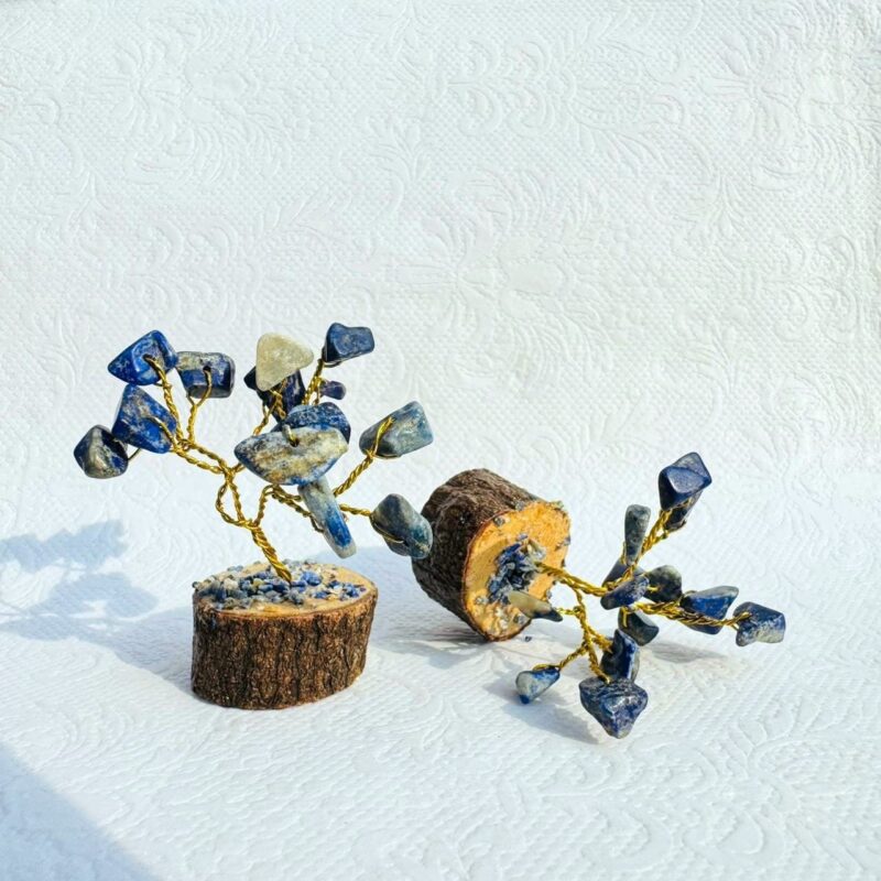 Handcrafted Lapis Lazuli gemstone bonsai tree with blue stone chips and a natural wood base. A grounding decor piece symbolizing strength, stability, and balance.