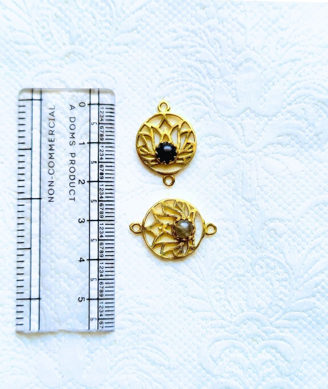 Add a touch of elegance and earthy charm to your creations with our Lotus gemstone brass charms. These premium connectors are made with an antique gold-tone brass alloy base and feature a polished gemstone cabochon at the center. Each piece is meticulously crafted, making it perfect for jewelry making, macrame art, and other creative projects.