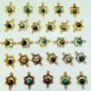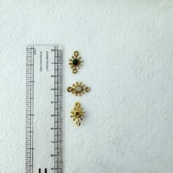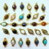 This beautiful assortment of brass mix gemstone charms includes a variety of miniature sunburst-style connectors, each set with a colorful natural stone cabochon. The stones feature a diverse palette of shades—turquoise, green, black, red, blue, orange, and white—bringing warmth and color to any handmade creation. Each piece is made from solid brass with a polished golden finish and small loops for easy attachment on both sides. These charms are ideal for use in macramé jewelry, earrings, layered necklaces, anklets, and bracelets. Their compact size and versatile shape make them a favorite for both minimalist and bohemian designs.
