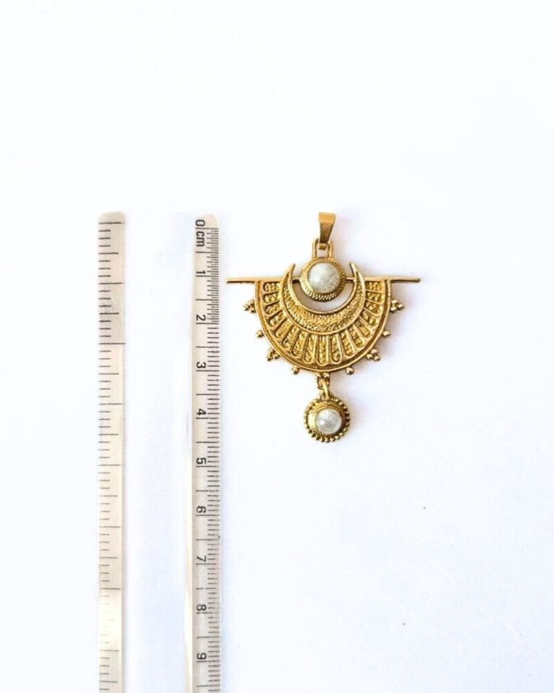This elegant crescent-inspired brass connector features a beautifully detailed semicircular design with fine engraved patterns that radiate outward like sun or moon rays. The piece is accented with round pearl-like stones, adding a soft luminous contrast to the warm brass tone.