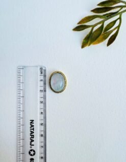 This oval moonstone groove stone features a smooth, polished natural cabochon set inside a classic brass bezel with a finely detailed grooved edge. The moonstone displays gentle milky tones with subtle natural reflections, giving each piece a calm, ethereal character.