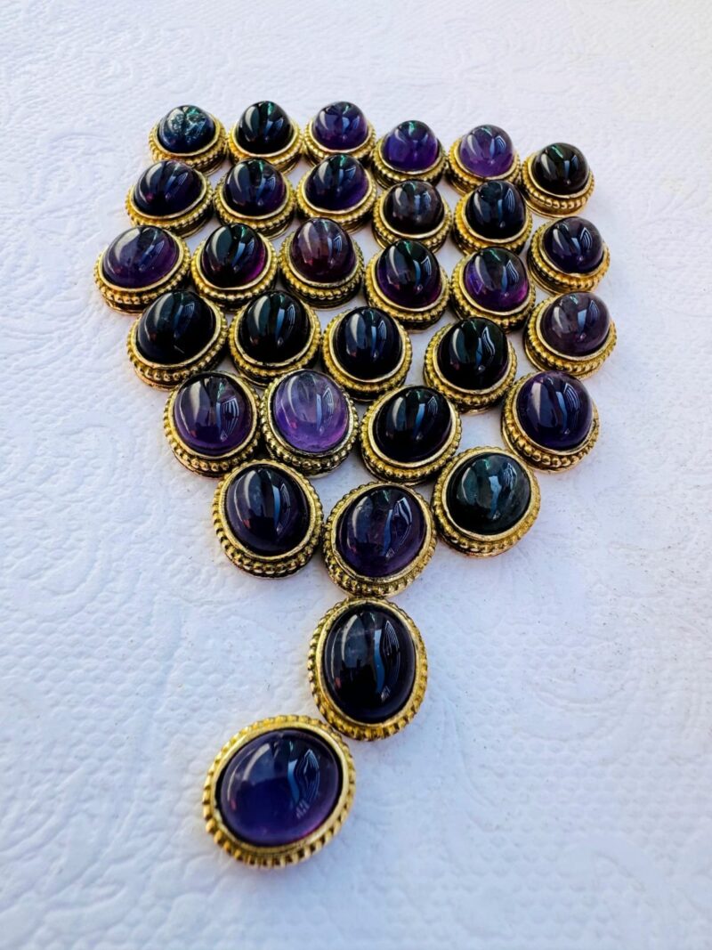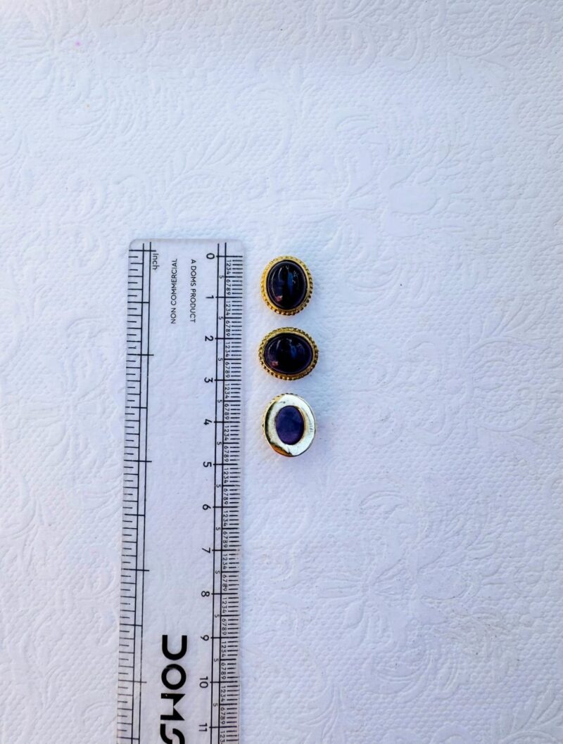 This brass cabochon settings showcases oval stones in shades of Amethyst, each securely encased in a detailed brass bezel. The brass frame features a subtle rope like groove around each edge, adding both texture and richness to the design.