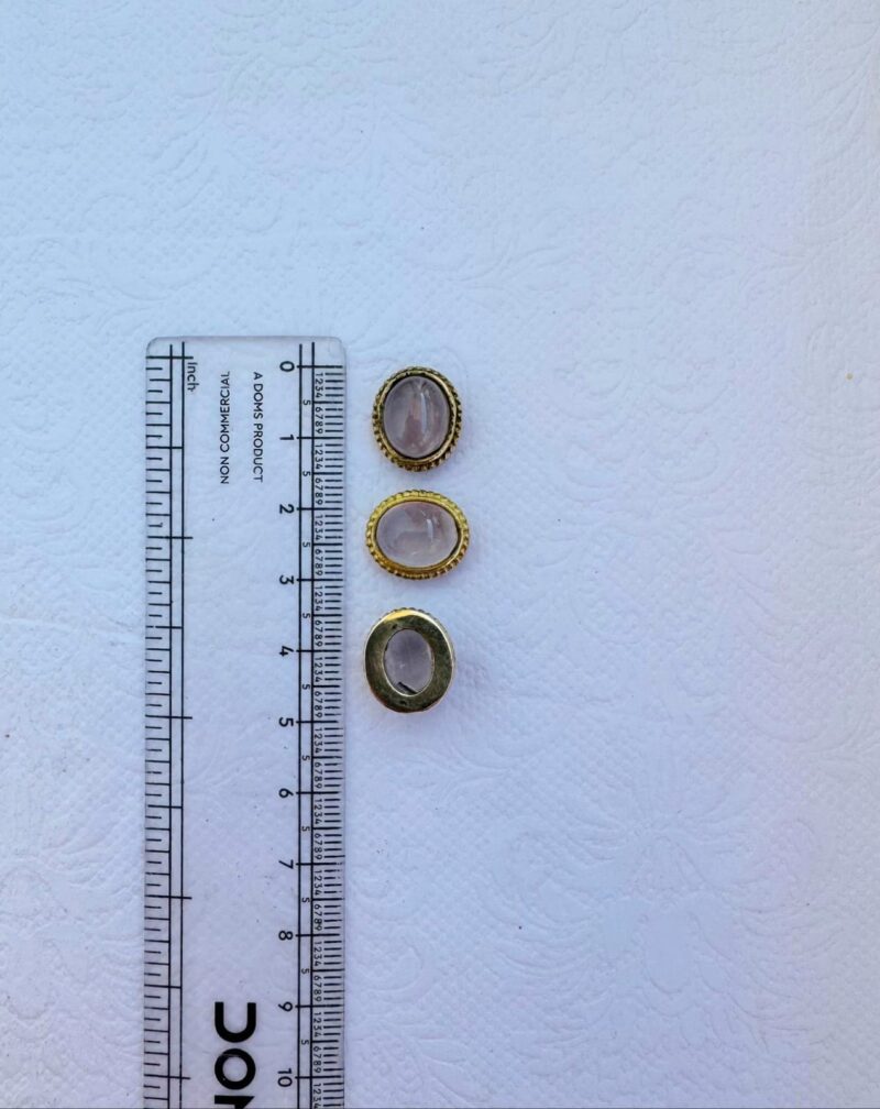 This brass cabochon settings showcases oval stones in shades of Rose Quartz, each securely encased in a detailed brass bezel. The brass frame features a subtle rope like groove around each edge, adding both texture and richness to the design.