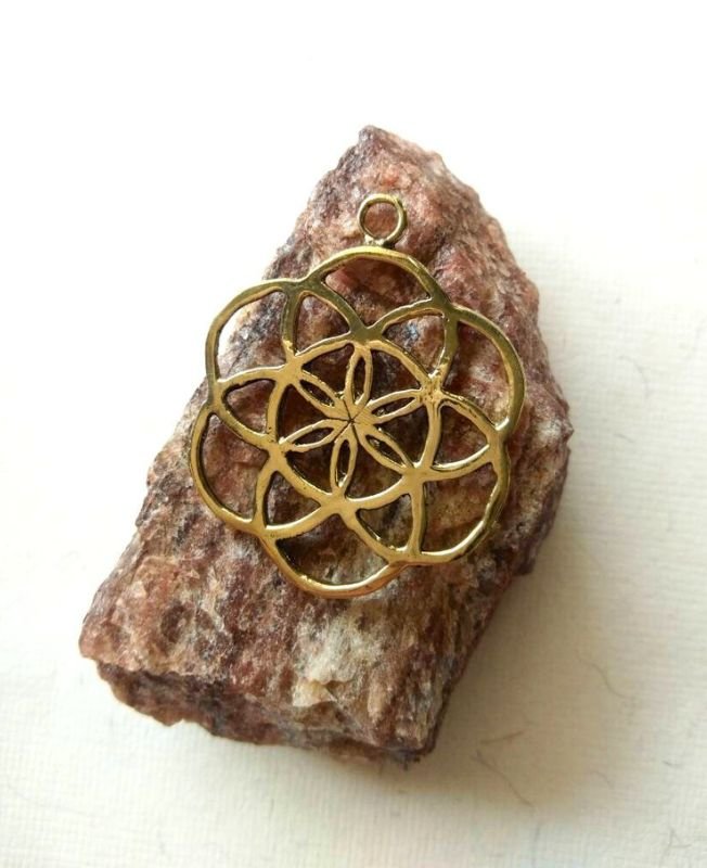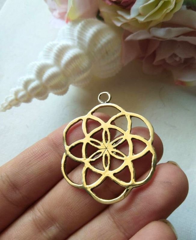 A luminous openwork brass pendant inspired by sacred seed geometry and floral mandala forms. Perfect for spiritual jewelry, macrame wall art or meaningful handmade creations