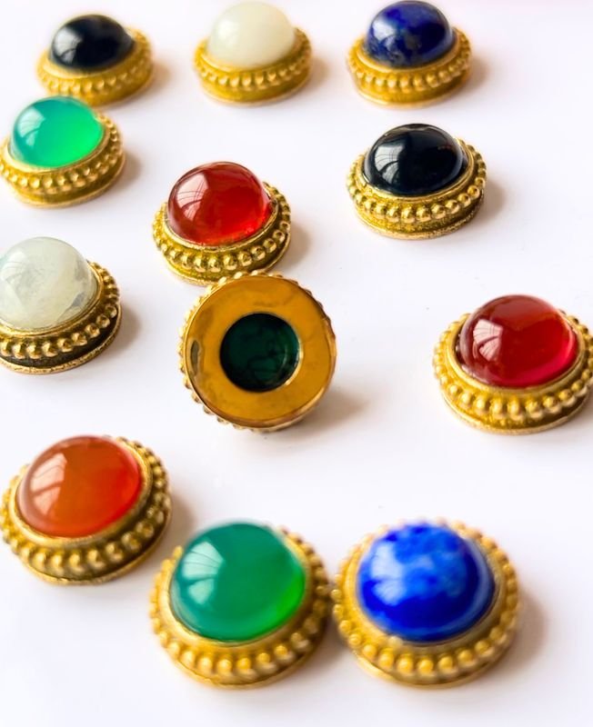 A stunning collection of round brass grooved set stones, perfect for micro macrame, wire wrapping, or handcrafted jewellery. Each cabochon features a grooved brass border with a smooth, polished gemstone center—adding rich colour and vintage charm to your designs.