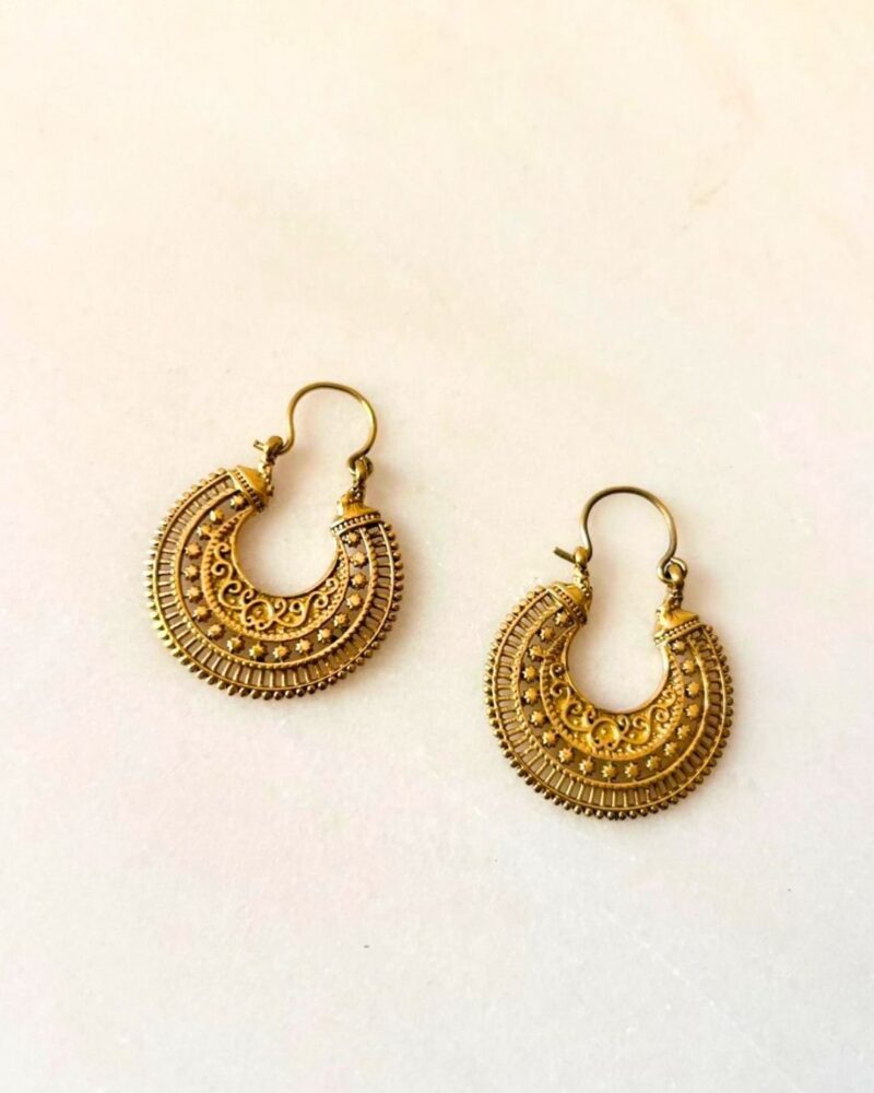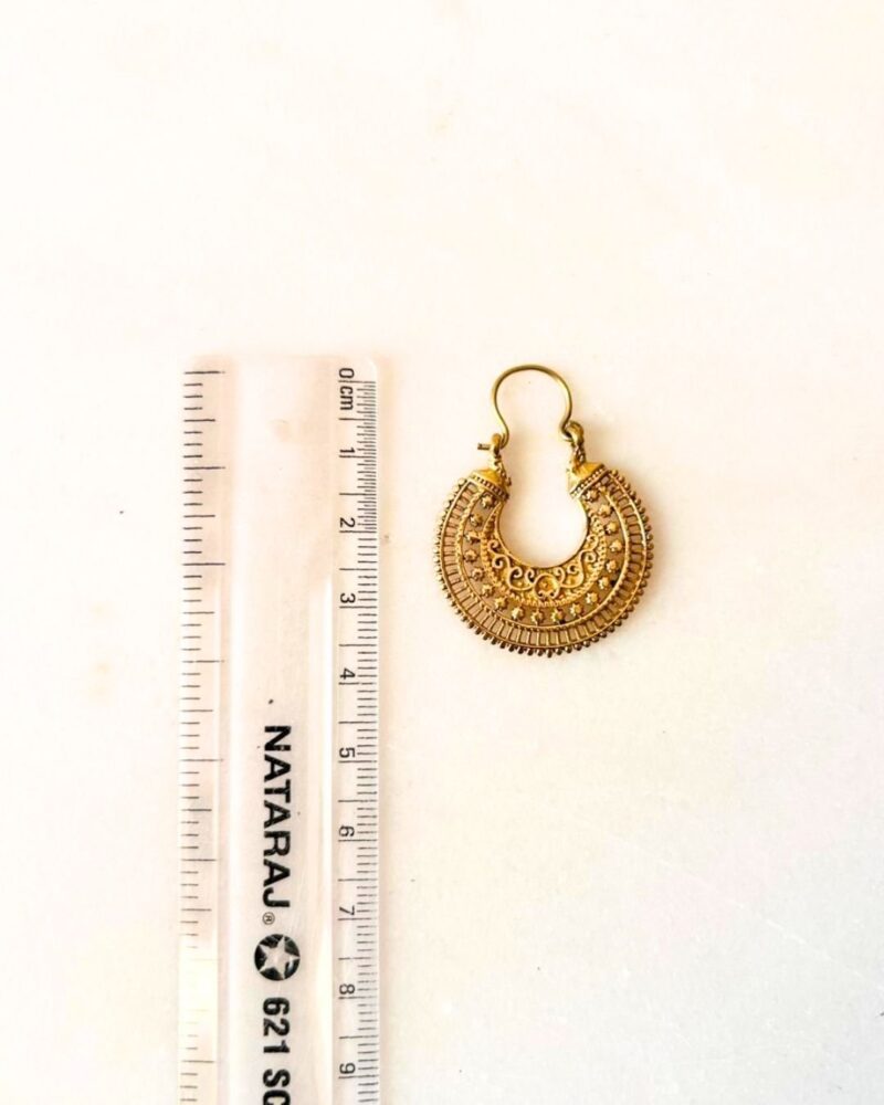 This elegant brass hoop earring features a crescent-shaped design richly decorated with layered textures and delicate filigree scrollwork. The surface combines fine engraved patterns, small star-like accents, and ornamental arches that create a beautifully balanced and detailed composition.