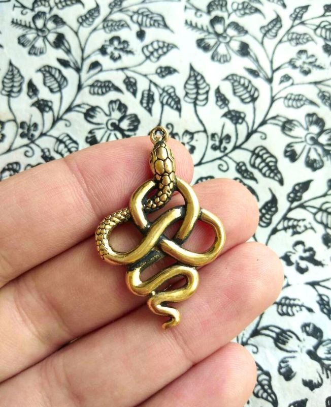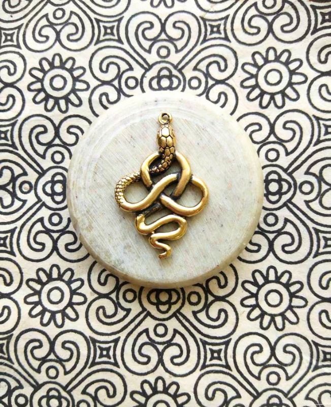 Bold and intricate snake pendant featuring a coiled knot design, symbolizing mystery and transformation. The detailed antique brass finish adds a striking touch to spiritual, boho, or gothic jewelry styles