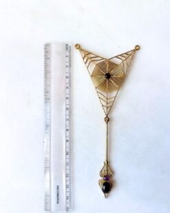 At the center of the web sits a round gemstone cabochon, adding depth and contrast to the warm brass framework. From the lower point of the web hangs a long decorative extension ending in a sculpted spider motif with two gemstone accents, creating movement and enhancing the symbolic character of the piece.