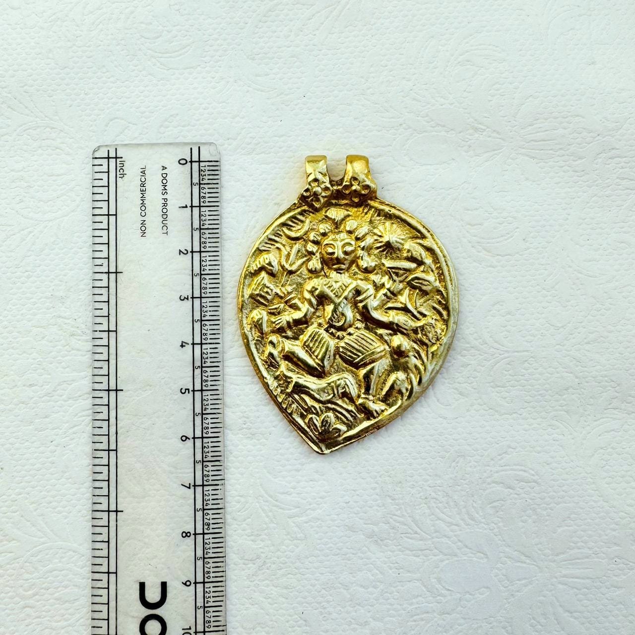 This striking brass pendant charm is crafted in a heart-shaped form and showcases a highly detailed raised mythical figure at its center. The figure appears in a dynamic, almost dance like posture, surrounded by flowing elements and decorative textures that give the piece a powerful, story driven presence.