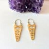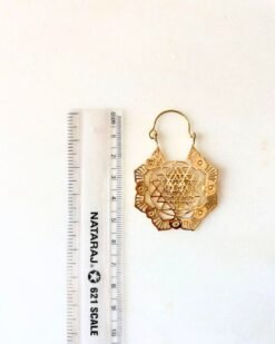 This beautifully detailed brass hoop earring showcases the sacred Sri Yantra geometry at its center, surrounded by an ornate mandala-inspired border. The layered geometric pattern symbolizes harmony, balance, and spiritual connection, making the design both visually captivating and meaningful.