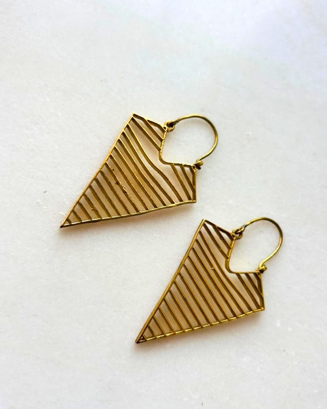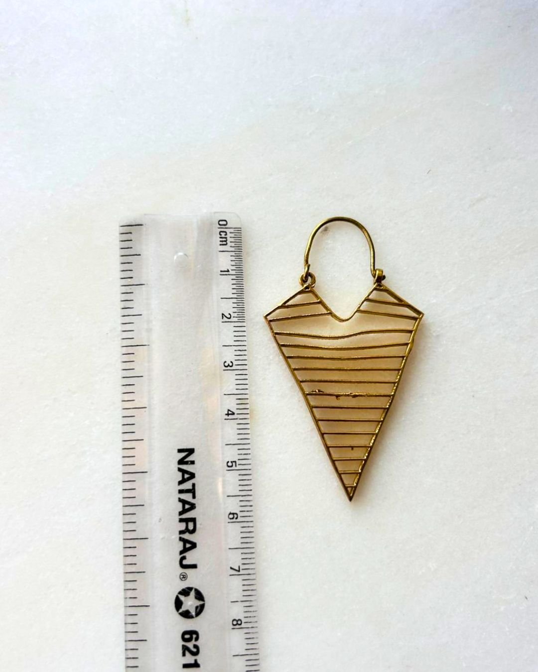 This striking brass earring features a sharp inverted triangle silhouette accented with fine horizontal line detailing across the surface. The structured geometric shape creates a strong, modern aesthetic while the open linear design keeps it visually light and wearable.