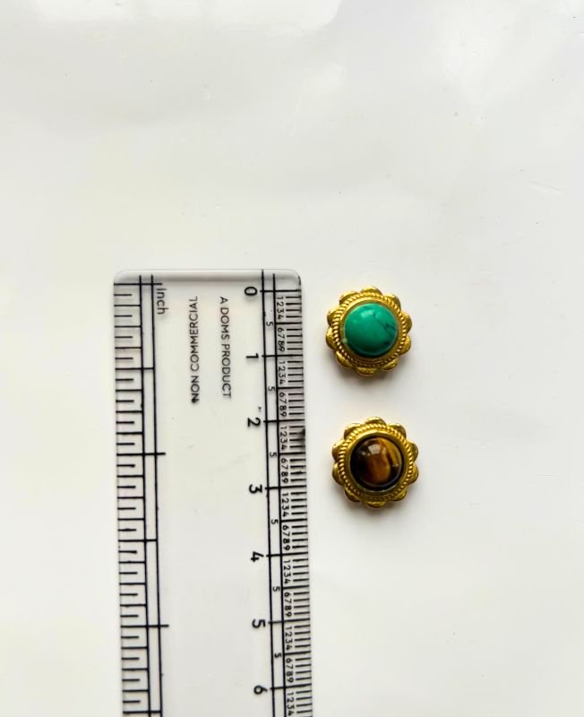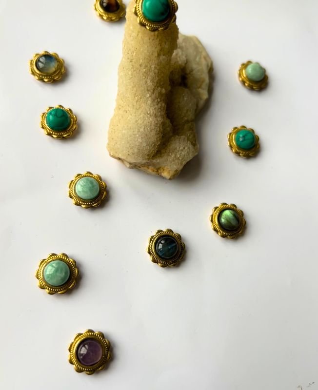 These brass grooved gemstone connectors feature a flower like bezel setting are ideal for micro macrame artists, jewellery makers, and designers seeking a blend of elegance and bohemian charm. Handcrafted from solid brass with intricate rope-like grooved detailing, each piece is embedded with a semi-precious gemstone such as turquoise, green aventurine, tiger’s eye, or amethyst. The detailed flower design surrounding the central stones gives the piece an antique, almost regal finish.