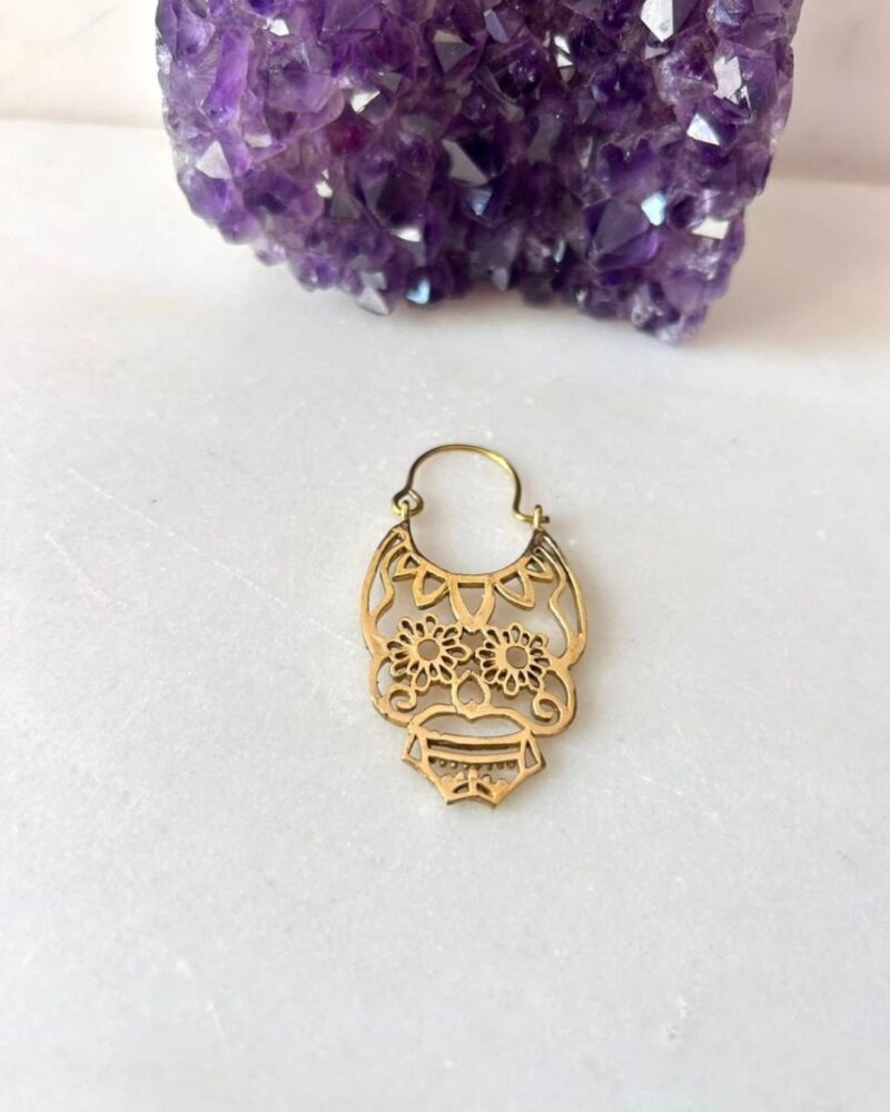 Handcrafted gold plated brass earring featuring a decorative sugar skull design with floral eye details. Lightweight and perfect for a bold yet elegant look.